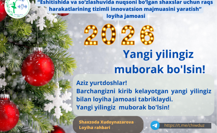 “Eshitishida va so‘zlashuvida nuqsoni bo‘lgan shaxslar uchun raqs harakatlarining tizimli innovatsion majmuasini yaratish” loyiha jamoasi barchangizni kirib kelayotgan yangi yilingiz bilan loyiha jamoasi tabriklaydi. Yangi yilingiz muborak bo’lsin!
