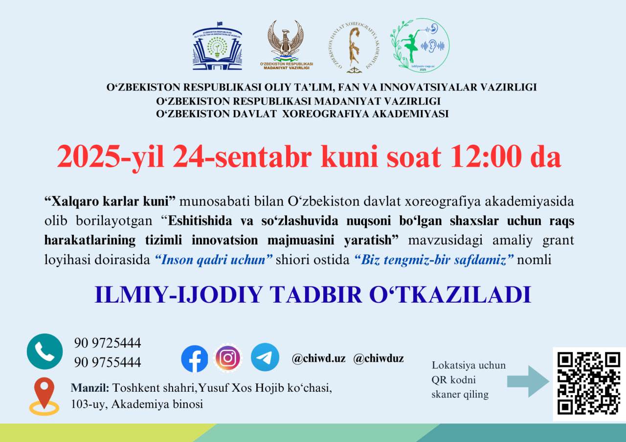 • 2025-yil 2-dekabr kuni soat 13:00 da ilmiy ijodiy tadbir bolib o’tadi!